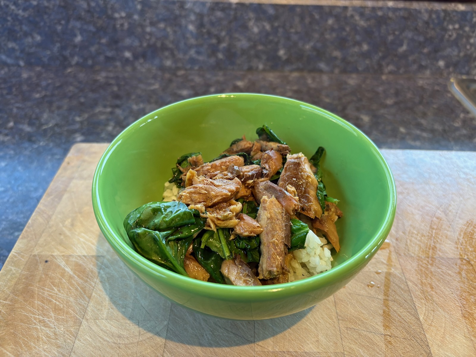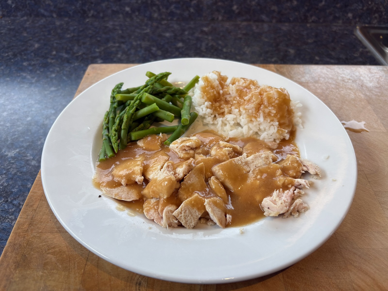 Dinner: Roasted chicken (4.5 oz.), rice, and gravy. Asparagus. A half glass of Bota Box sauvignon blanc.