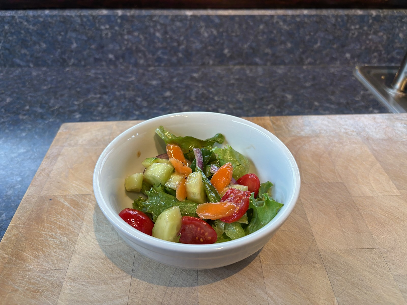 Lunch: Quiche and salad. Salad with lettuce mix, cucumber, tomato, carrot, celery, green pepper, red onion, and balsamic dressing. 1/6 of a quiche lorraine (283 cal). A half glass of Bota Box sauvignon blanc.