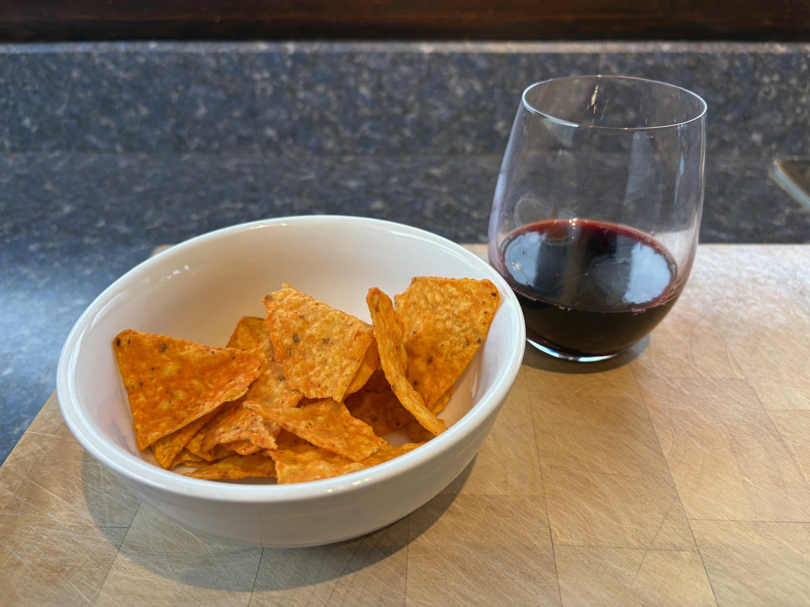 Snack: 2.0 oz. Doritos and red wine (twice the amount pictured).