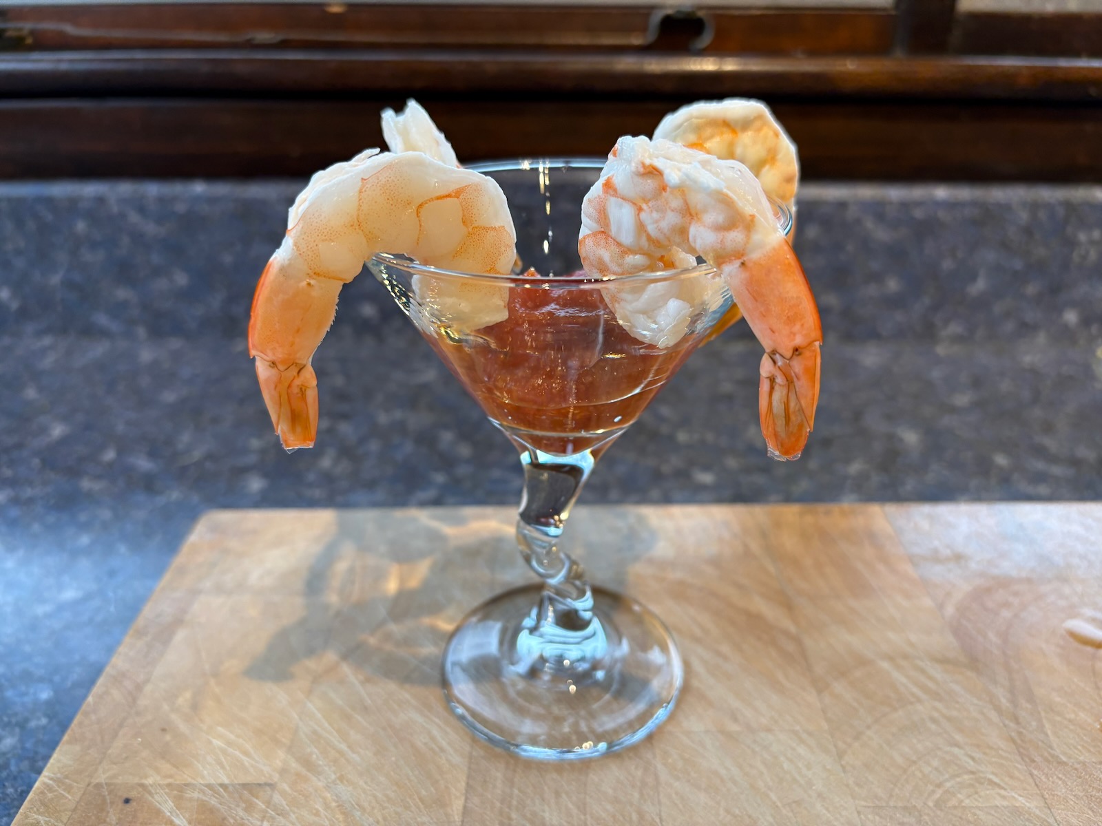Snack: Shrimp cocktail. A half glass of Bota Box cabernet sauvignon.