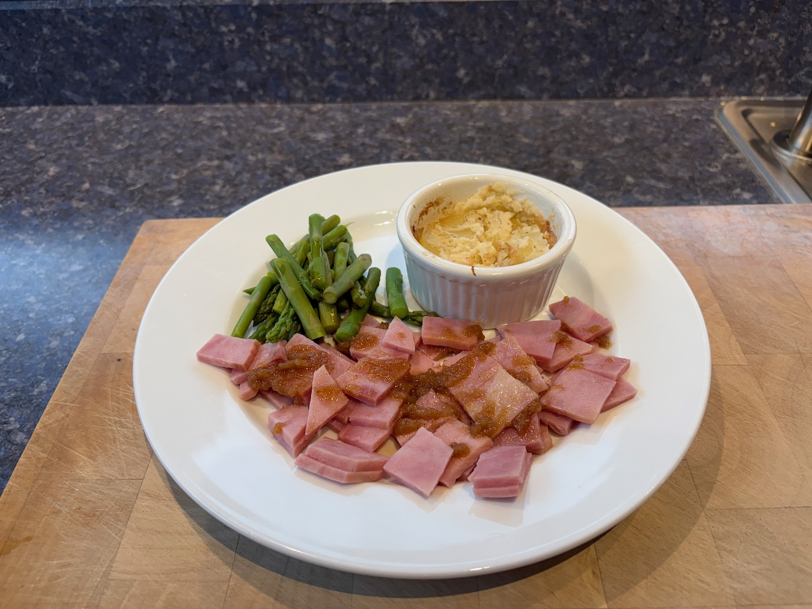 Dinner: Ham and scalloped potatoes. With asparagus. A half glass of Bota Box cabernet sauvignon.