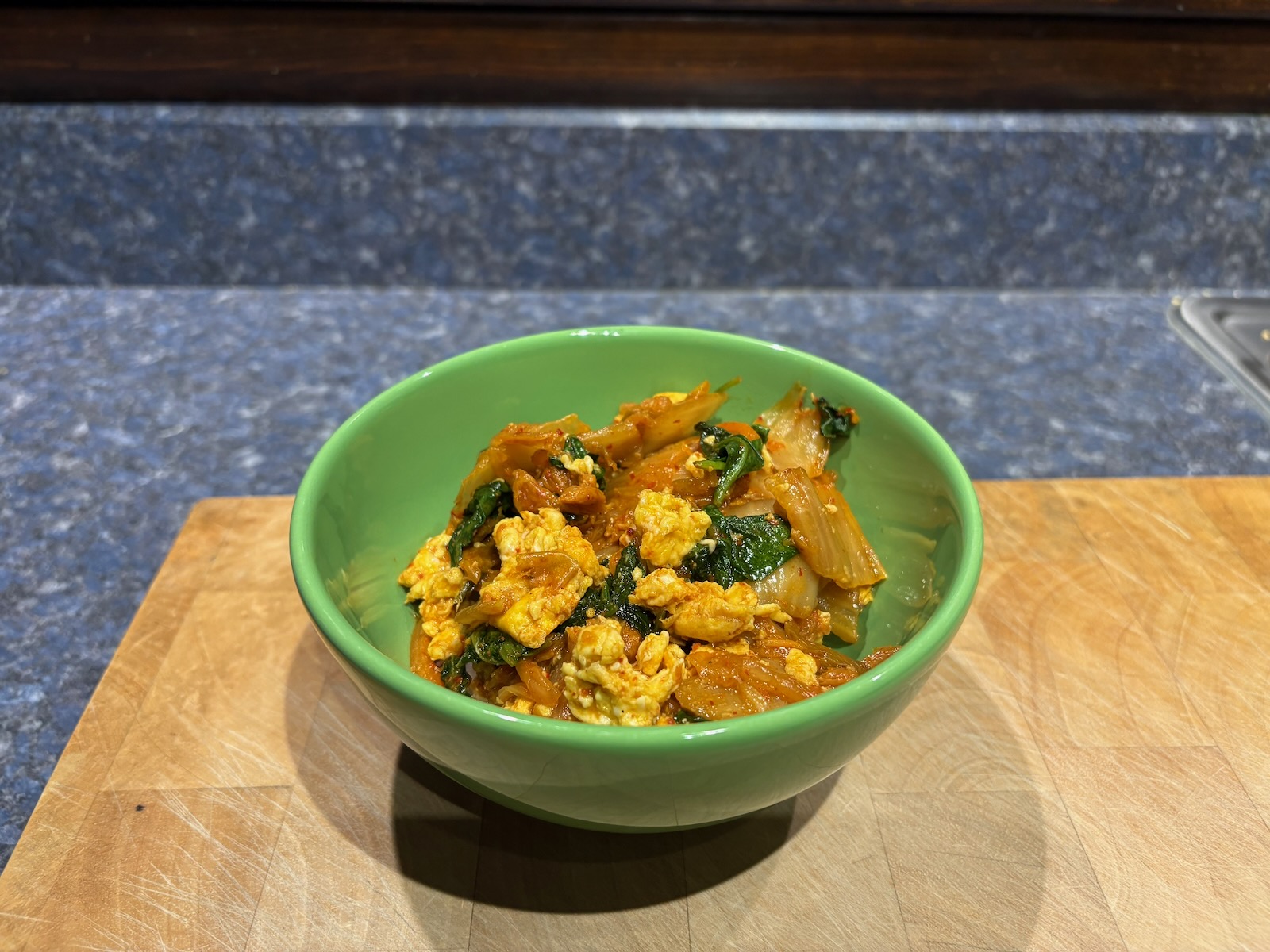 Breakfast: Kimchi scrambled eggs on a bed of rice.