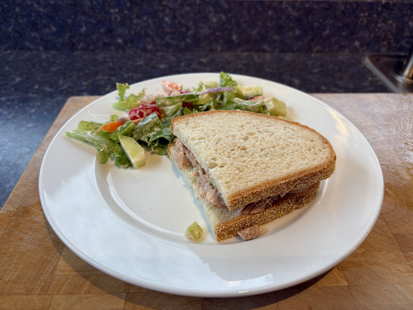 Lunch: Spicy tuna salad sandwich on Heidelberg French peasant bread. Salad with lettuce mix, cucumber, tomato, carrot, celery, green pepper, red onion, and chipotle ranch dressing (20 grams, 93 cal).