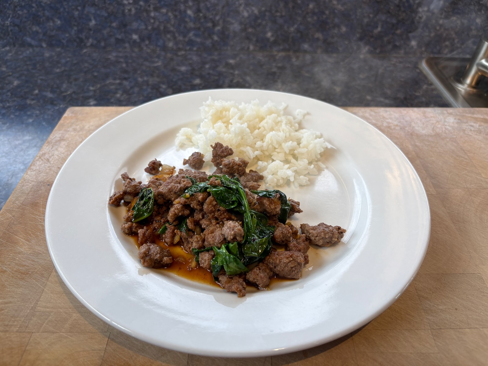 Dinner: Crushed hamburger (4.0 oz. before cooking) with spinach and rice. A half glass of Bota Box cabernet sauvignon.