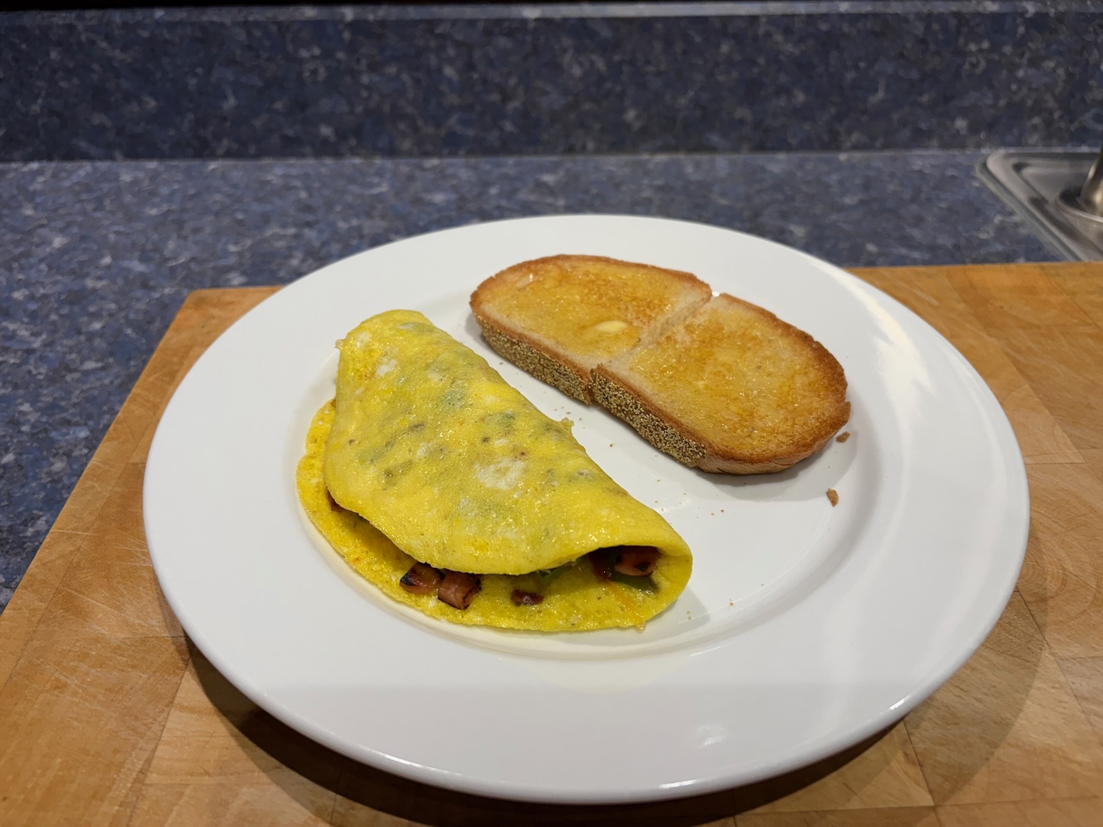 Breakfast: Spicy western omelette. Filling cooked Sunday and reheated, in 1 egg, freshly cooked. And Heidelberg French peasant bread toast with butter.