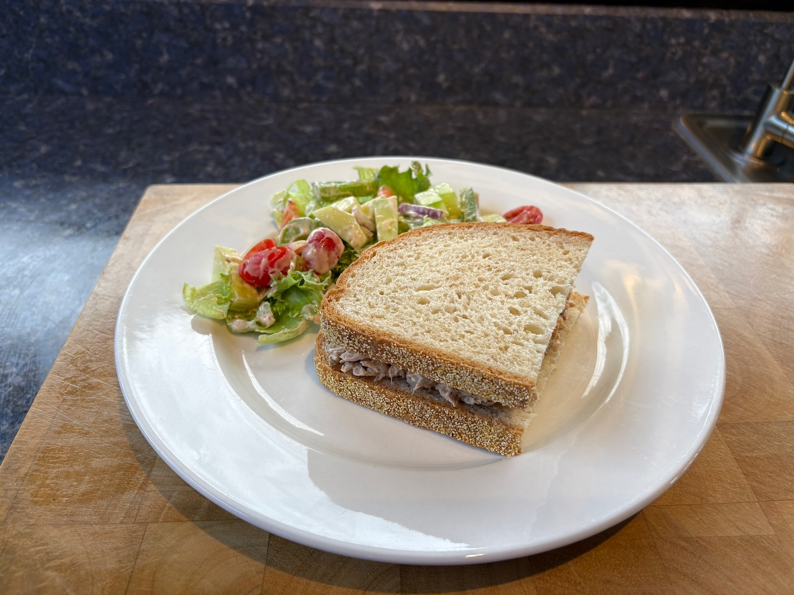 Lunch: Spicy tuna salad sandwich on Heidelberg French peasant bread. Salad with lettuce mix, cucumber, tomato, carrot, celery, green pepper, red onion, and chipotle ranch dressing (20 grams, 93 cal).