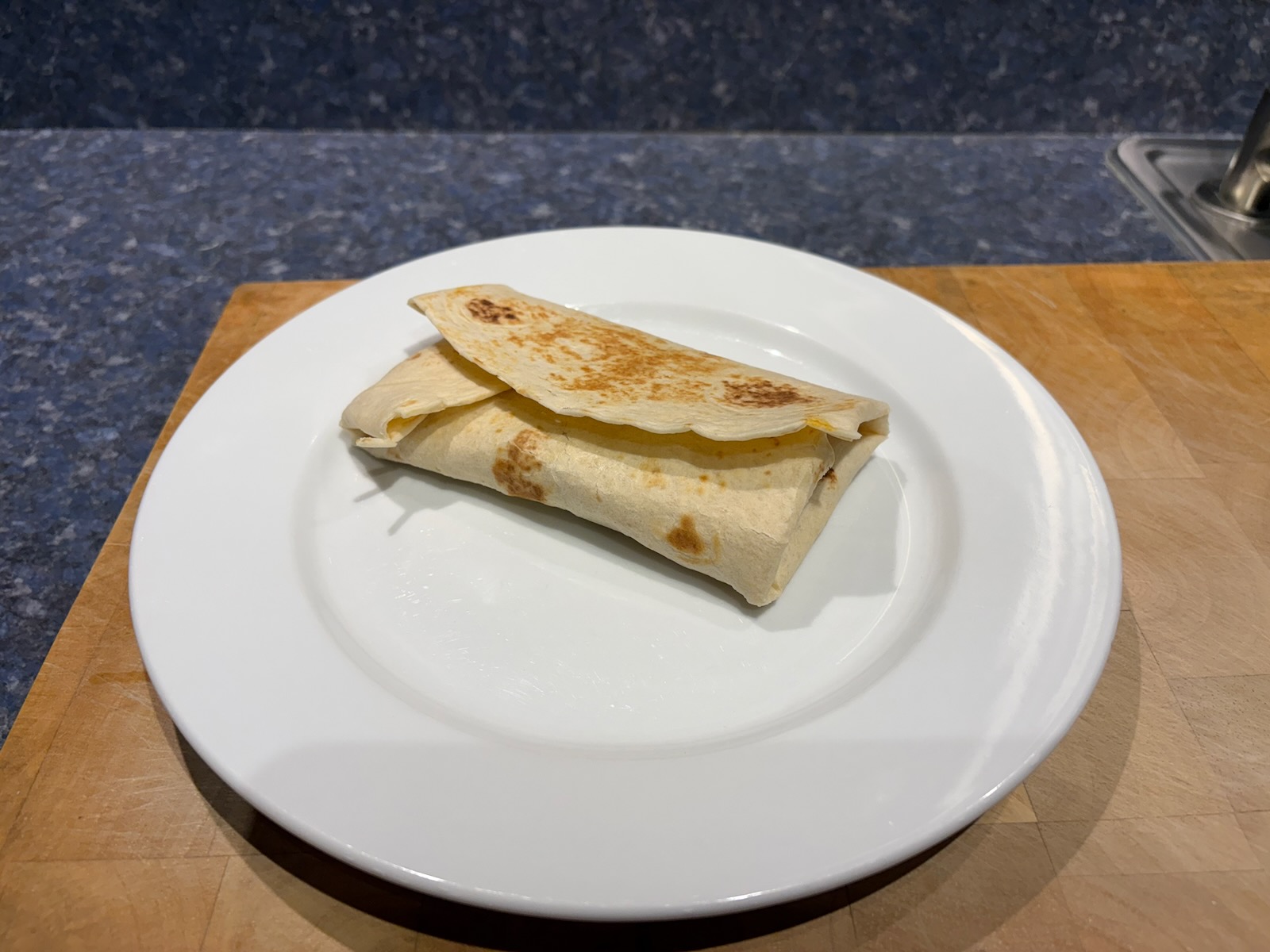 Breakfast: Chorizo breakfast burrito with chorizo, onion, green pepper, jalapeƱo, and egg. Reheat of the filling I cooked Saturday in a freshly heated flour tortilla.