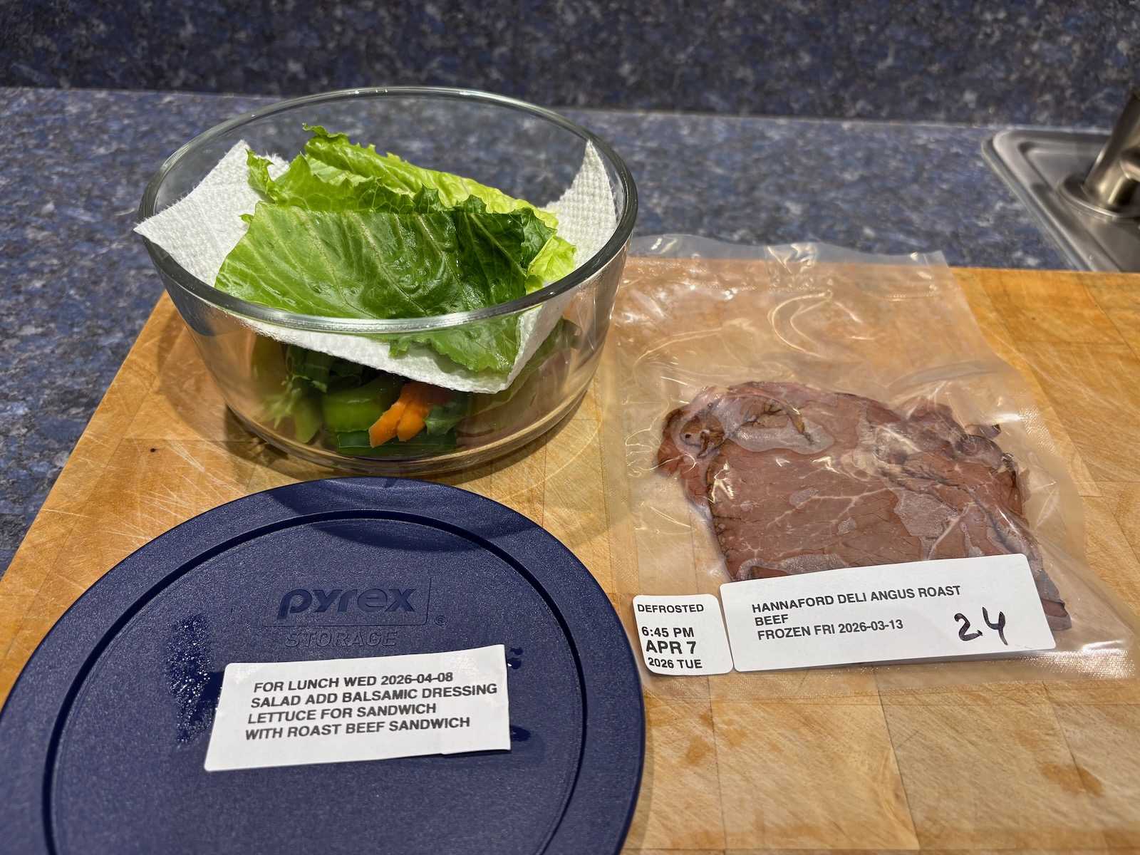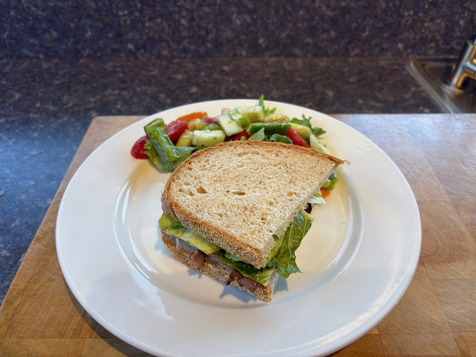 Lunch: Roast beef sandwich. With 2.4 oz. deli roast beef, lettuce, horseradish, and mayo on Heidelberg French peasant bread. Salad with lettuce mix, cucumber, tomato, carrot, celery, green pepper, red onion, and balsamic dressing.