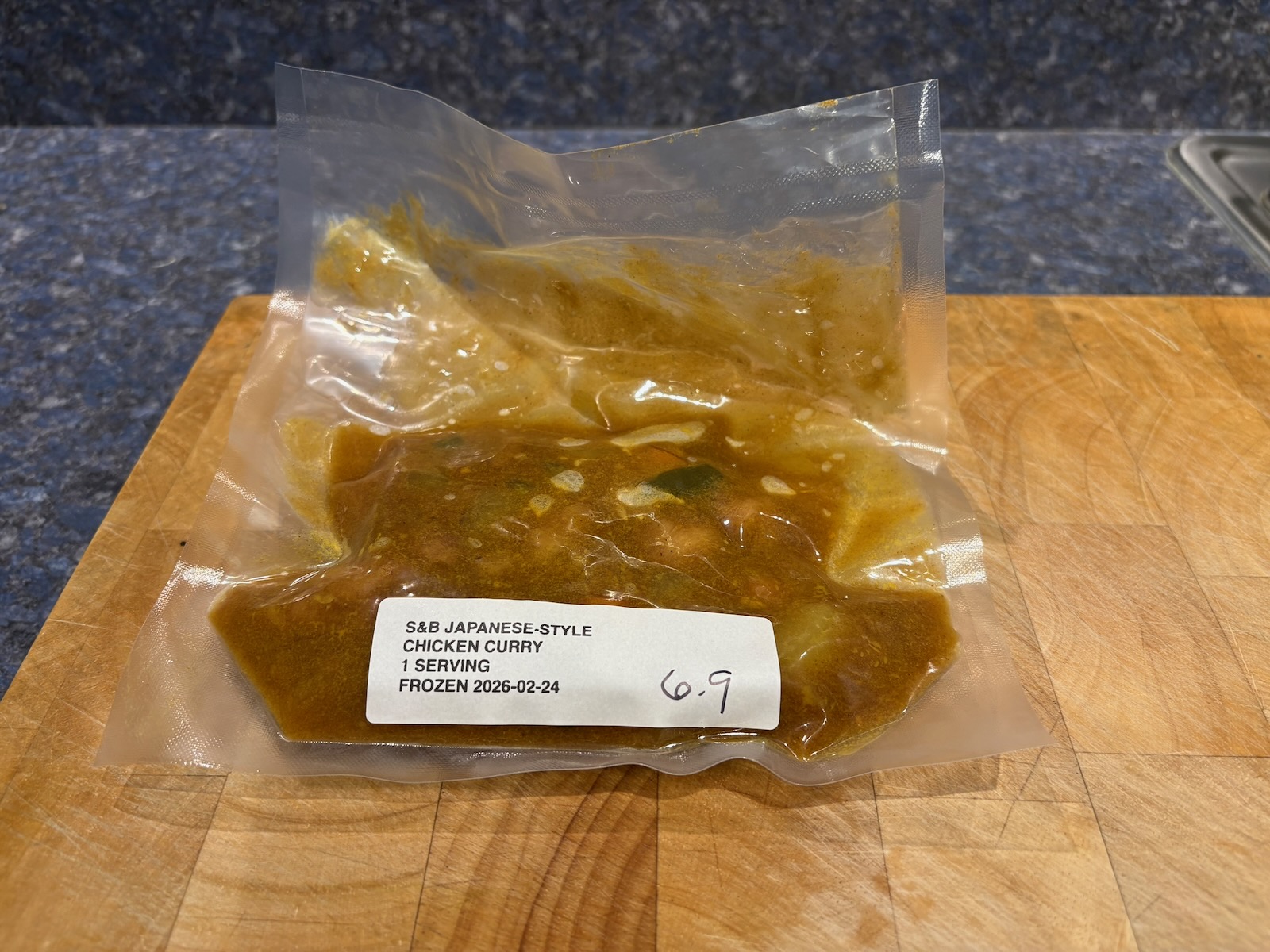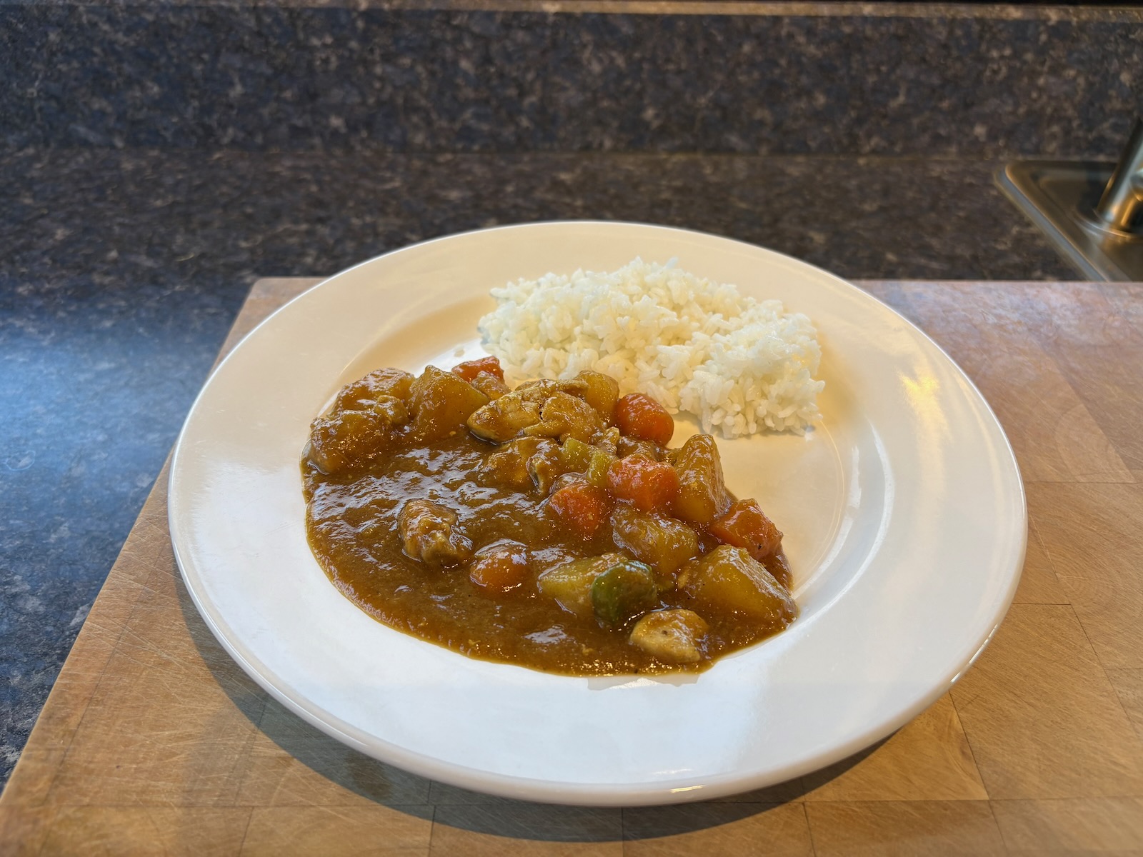 Dinner: Japanese-style chicken curry (6.9 oz). Rice. A half glass of Bota Box sauvignon blanc.