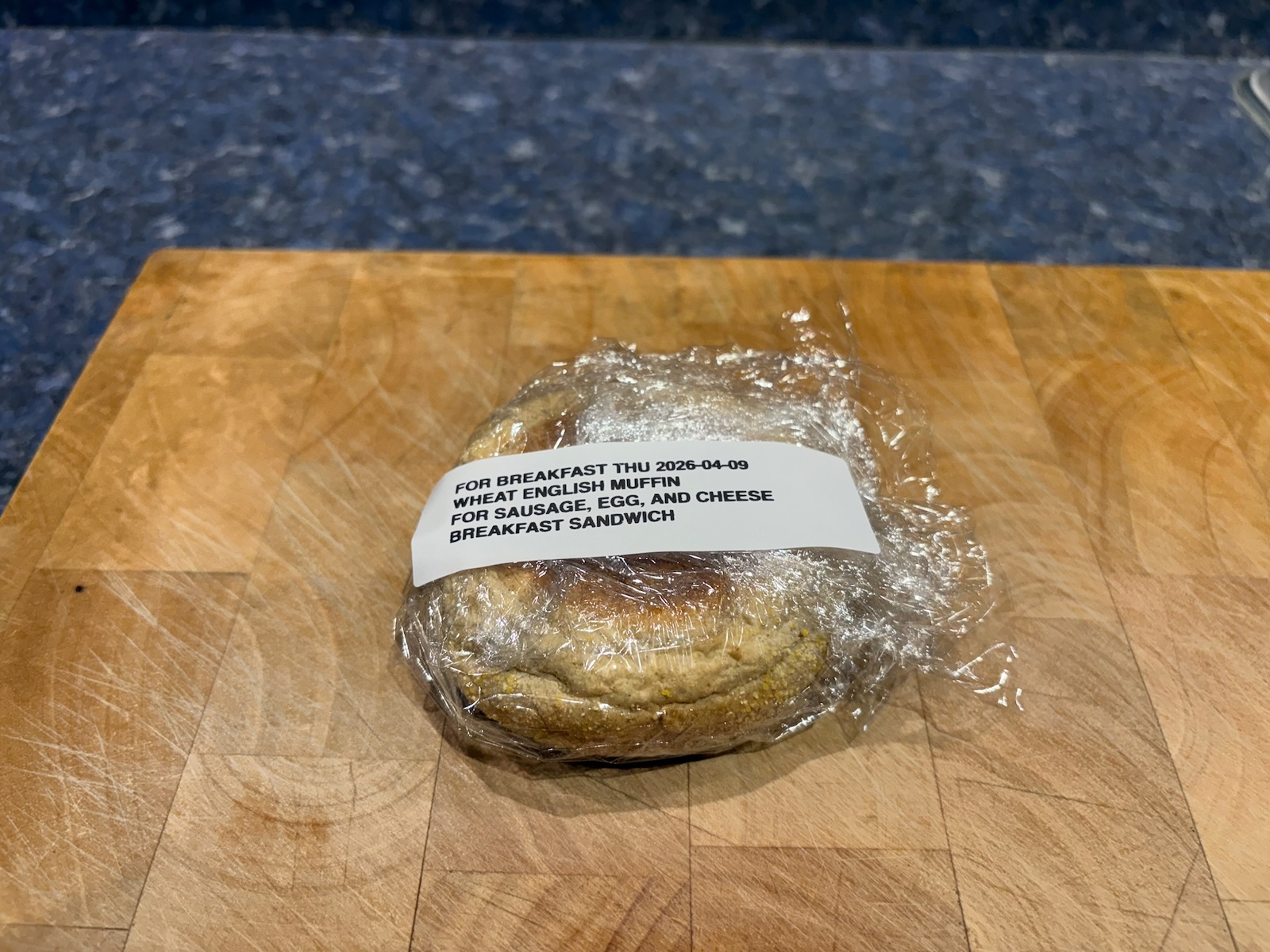 Defrosted an English muffin for sausage, egg, and cheese tomorrow.